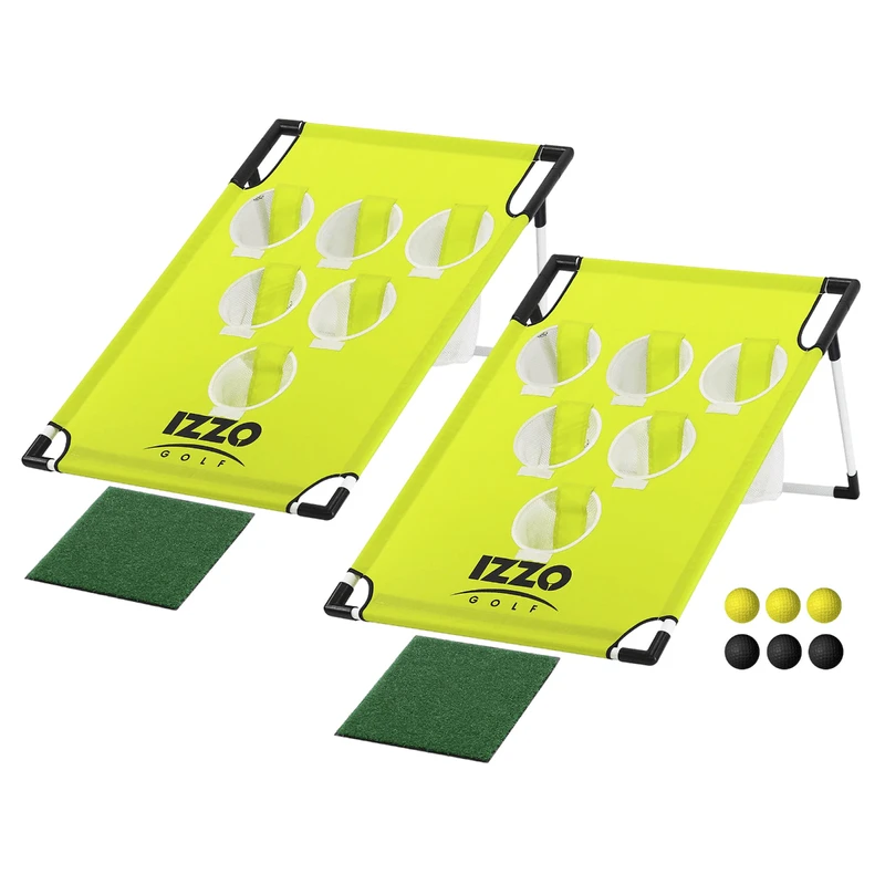 The Izzo Golf Pong-Hole Chipping Game provides the ultimate in versatility and fun. Easily transportable in a lightweight nylon carry bag, bring this game to the beach, BBQ, camping, tailgate anywhere! Or simply set up in the backyard for everyday practice. The Izzo Pong-Hole Set is a snap to set up with everything you need for play – includes 6 foam practice golf balls, 2 hitting mats and 2 sets of interchangeable game-format play covers for double the value and fun. Practice (or play) with a basic chipping game, or create your own version of points-based Corn-Hole, or install the Pong covers and play a chipping version of this popular game.