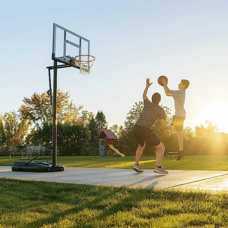 The Lifetime Polycarbonate Portable Basketball System features a clear view, Steel-Framed Shatterproof backboard with a Speed Shift height adjustment mechanism that adjusts from 8 to 10 feet high. The new Clearview Backboard eliminates backboard braces to increase stability and target visibility. It also includes a Slam-It Rim with an all-weather nylon net and a 3″ diameter round steel pole. With a 34-gallon portable base, this system can easily be moved to a desired location.
