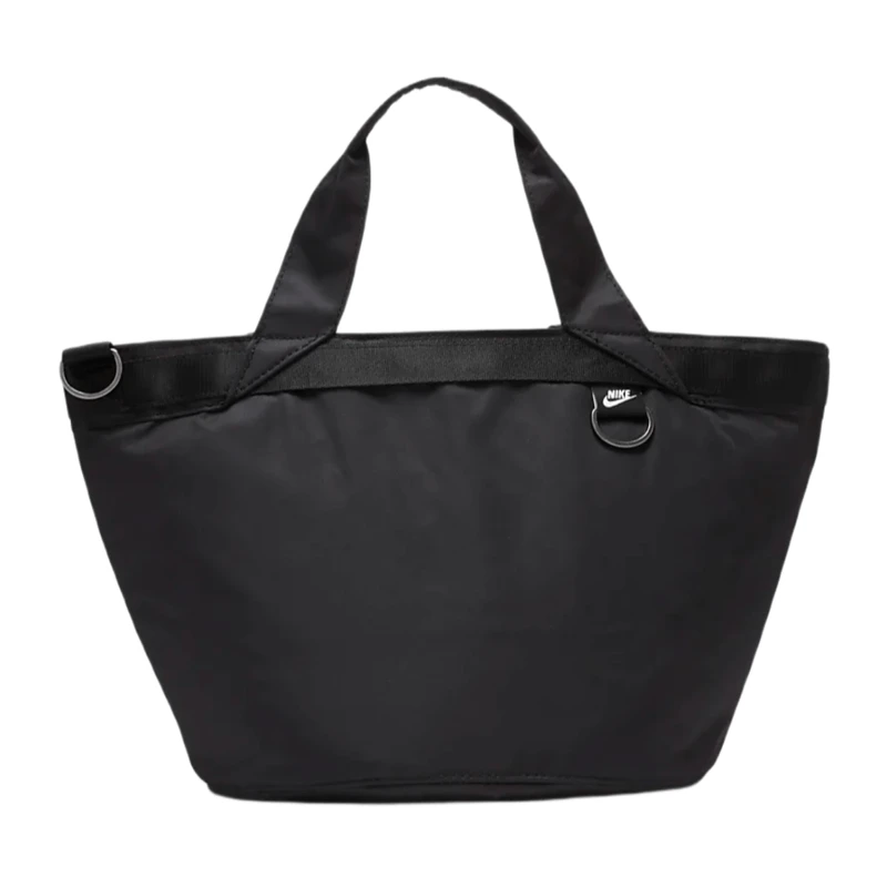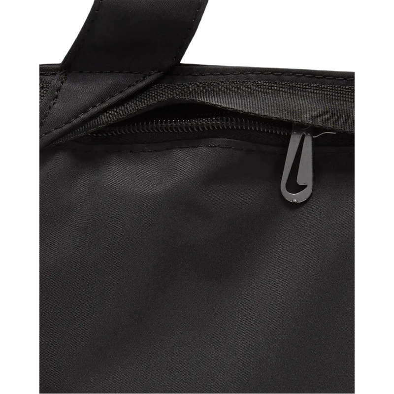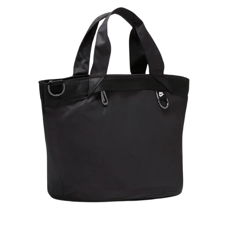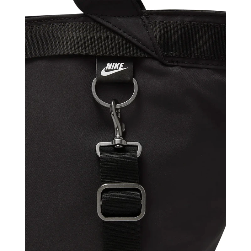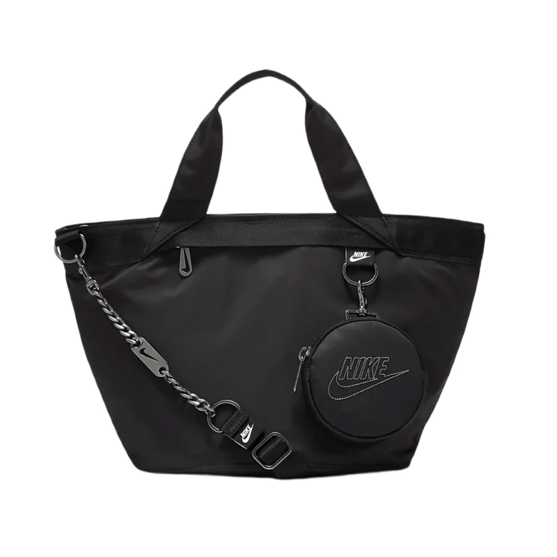 Designed to match your flash, the Nike Sportswear Futura Tote elevates a Nike favorite with polished metal accents, a satin lining and removable clip-on accessories pouch. The large main compartment with zip closure secures your stuff while additional pockets inside and out help keep you organized on the go. This product is made with at least 50% recycled polyester fibers. Â