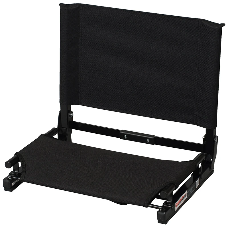 Gamechanger Stadium Chair is made of tough Cordura canvas with patented bungee-cord cushioning and black steel frame and provides comfort and durability. Hinged back for lower back support. Fits virtually any type of wood or metal bleacher. Secures to bleacher with bottom hook and features rubber non-slip skids. Maximum supported weight is 350 lbs