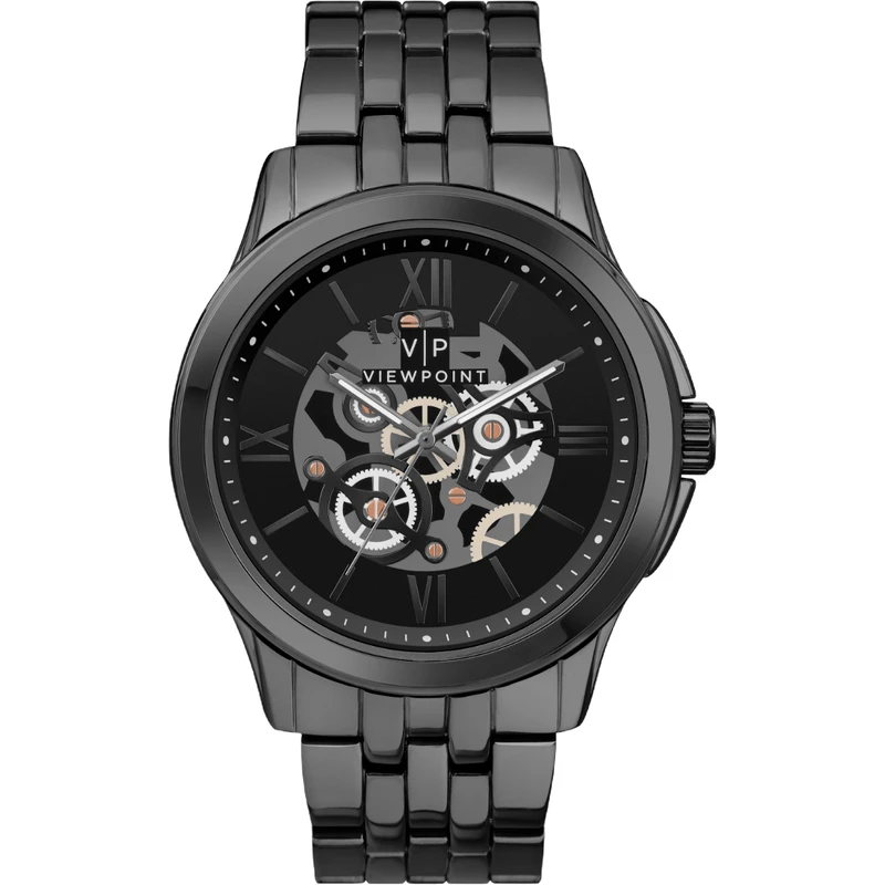 Timeless and sophisticated this Viewpoint by Timex watch is great for everyday use and features a silver-tone case and bracelet and a partial Roman numeral black detailed dial for a classic look.